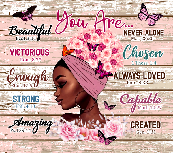 Inspirational Quotes Tumbler, You Are- Beautiful, victorious, Enough, Strong, Amazing, Never Alone, Chosen, Ways Loved, Capable, Created.